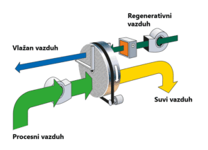 Adsorpcioni sušač koristi rotor impregniran silika gelom koji vezuje vodenu paru iz vazduha. Suvi vazduh se distribuiše u prostor, dok se rotor prilikom okretanja u određenoj zoni regeneriše toplim vazduhom i odvodi vlaga otpadnim vazduhom u spoljnu sredinu. Proces se odvija neprekidno, što omogućava stabilnu kontrolu vlage čak i kada je temperatura ispod nule.